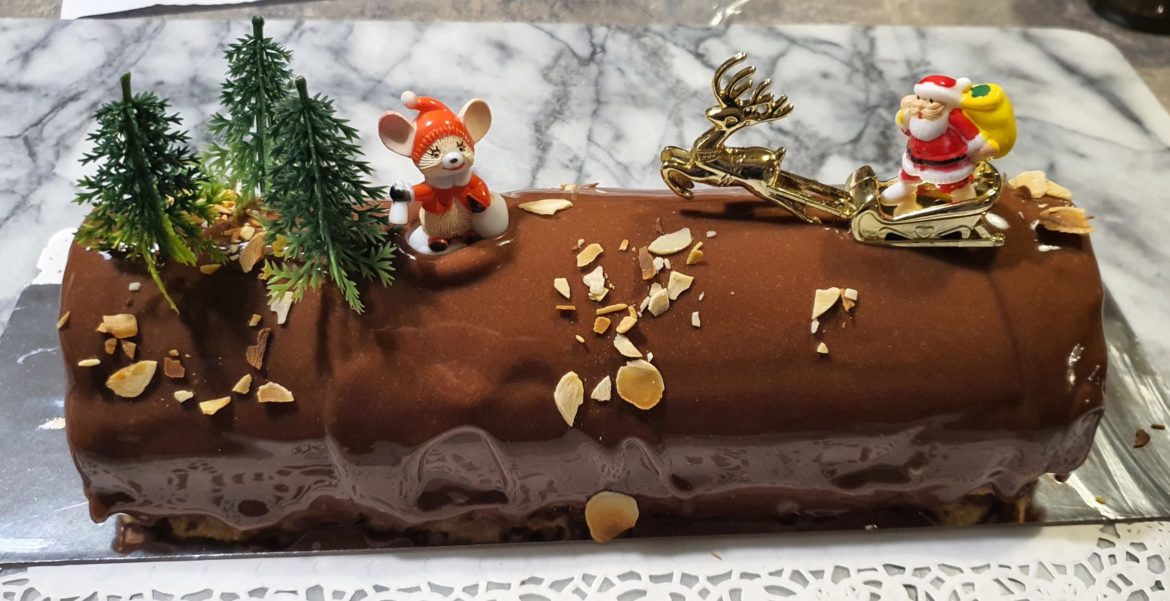 Une fois le glaçage à 31 degrés, glacer la bûche et laissez couler l’excédent dessous. Attendre un peu, mettre votre bûche sur un plat ou carton de dessous de gâteau et la garnir suivant vos envies. Mettre en boite, replacer au frais et laissez décongeler pendant 2 à 3 heures.